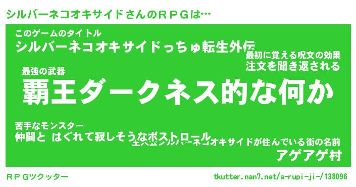 | 男性向けラノベタイトル風あだ名 | 『シルバーネコオキサイドアートオンライン』 |