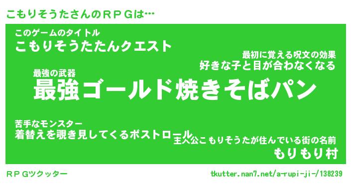 | 男性向けラノベタイトル風あだ名 | 『コモリソウタアートオンライン』 |