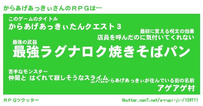 | 男性向けラノベタイトル風あだ名 | 『カラアゲアッキィアートオンライン』 |