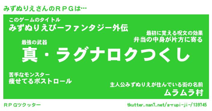 | 男性向けラノベタイトル風あだ名 | 『ミズヌリエアートオンライン』 |