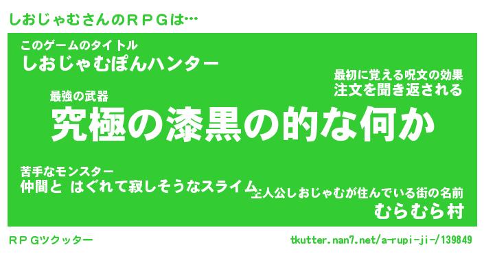 | 男性向けラノベタイトル風あだ名 | 『シオジャムアートオンライン』 |