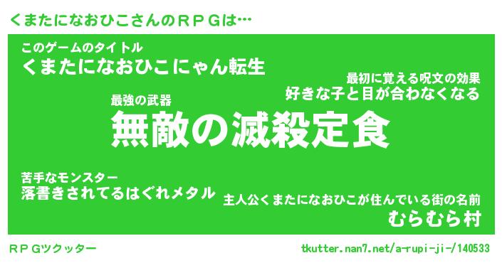 | 男性向けラノベタイトル風あだ名 | 『クマタニナオヒコアートオンライン』 |