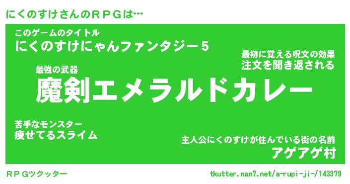 | 男性向けラノベタイトル風あだ名 | 『にくのすけの憂鬱』 |
