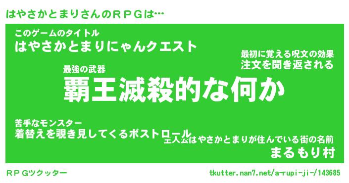 | 男性向けラノベタイトル風あだ名 | 『ハヤサカトマリアートオンライン』 |
