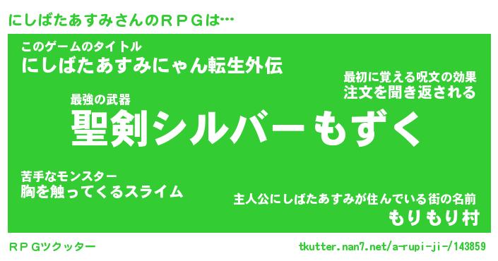 | 男性向けラノベタイトル風あだ名 | 『にしばたあすみの憂鬱』 |