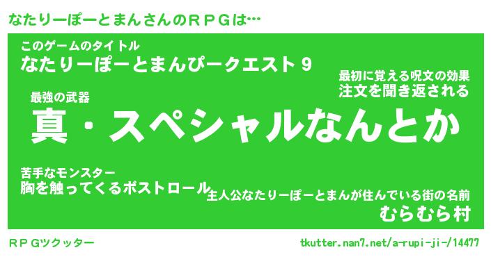| 胡散臭い通販商品みたいなあだ名 | 『億万長者になれるブレスレット…その名も「なたりーぽーとまん」』 |