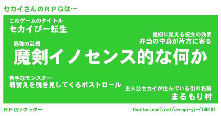 | 胡散臭い通販商品みたいなあだ名 | 『必ず成功する霊験あらたかなお札…その名も「セカイ」』 |