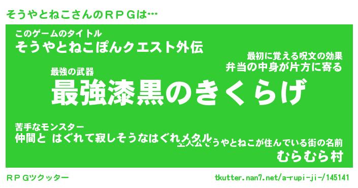 | 男性向けラノベタイトル風あだ名 | 『ソウヤトネコアートオンライン』 |