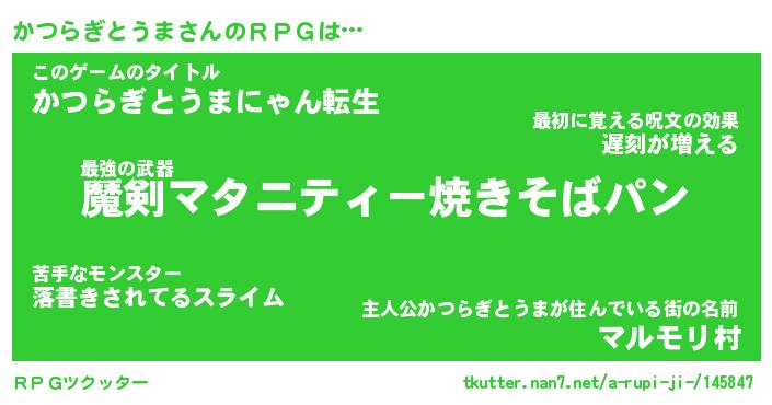 | 伝説のあだ名 | 『伝説のスナイパーかつらぎとうま』 |