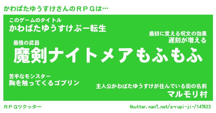 | 男性向けラノベタイトル風あだ名 | 『かわばたゆうすけの憂鬱』 |