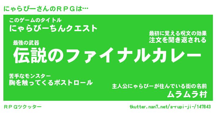 | 男性向けラノベタイトル風あだ名 | 『にゃらびーの憂鬱』 |