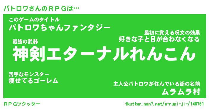 | ファンタジー風あだ名 | 『バトフェル』『エターナルバトロワー』 |