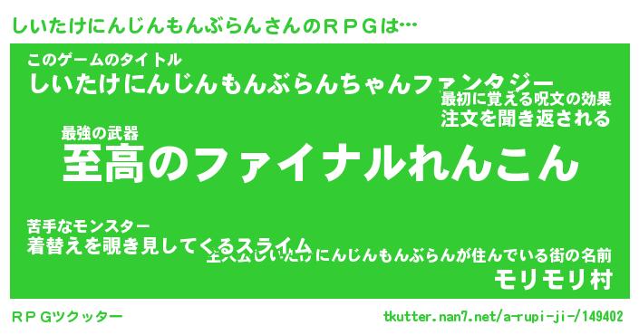 | 料理風あだ名 | 『節約★しいたけにんじんもんぶらんと油揚げの玉子丼』 |