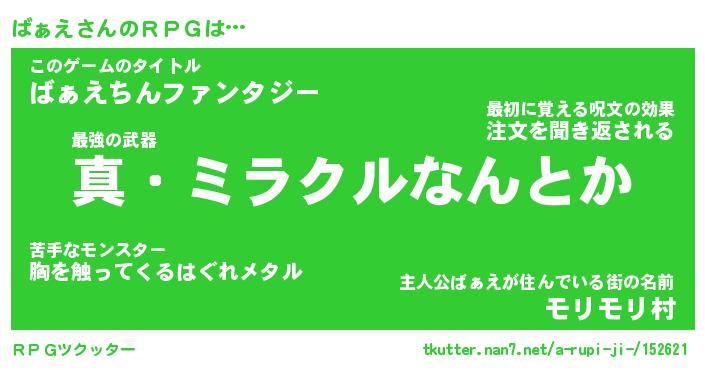 | ファンタジー風あだ名 | 『バァフェル』『エターナルバァエー』 |
