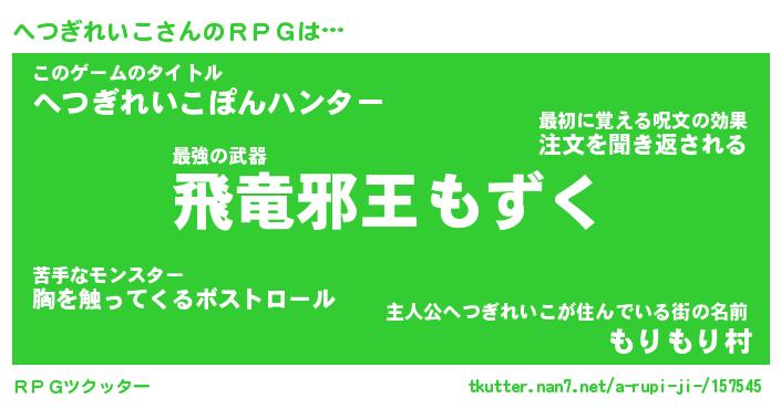 | 男性向けラノベタイトル風あだ名 | 『ヘツギレイコアートオンライン』 |
