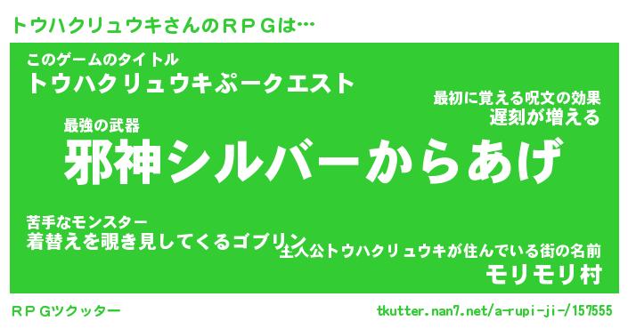 | 男性向けラノベタイトル風あだ名 | 『トウハクリュウキアートオンライン』 |