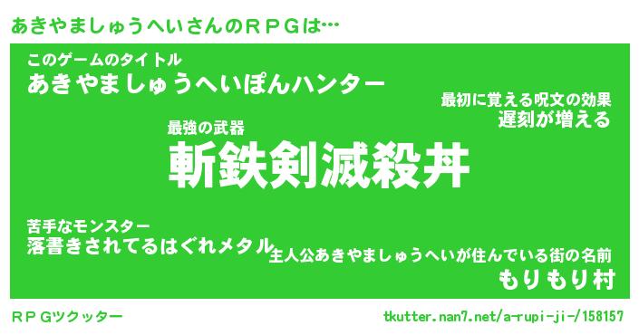 | 伝説のあだ名 | 『伝説のスナイパーあきやましゅうへい』 |