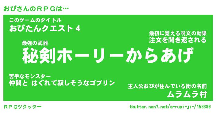 | 伝説のあだ名 | 『伝説の傭兵おぴ』『覚醒した遊び人おぴ』 |