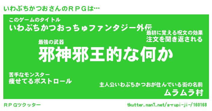 | 男性向けラノベタイトル風あだ名 | 『イワブチカツオアートオンライン』 |