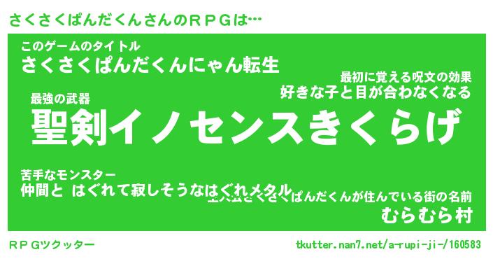 | 男性向けラノベタイトル風あだ名 | 『さくさくぱんだくんの憂鬱』 |
