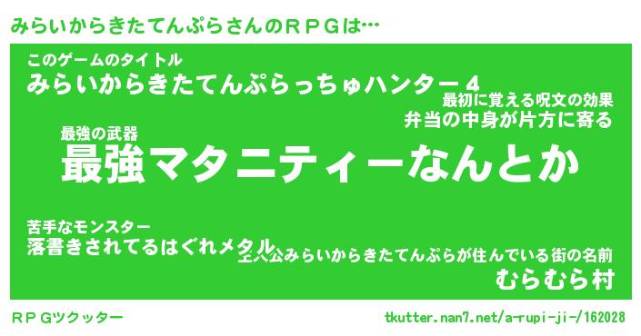 | 男性向けラノベタイトル風あだ名 | 『ミライカラキタテンプラアートオンライン』 |