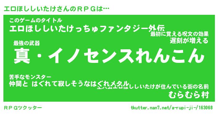 | 男性向けラノベタイトル風あだ名 | 『エロホシシイタケアートオンライン』 |