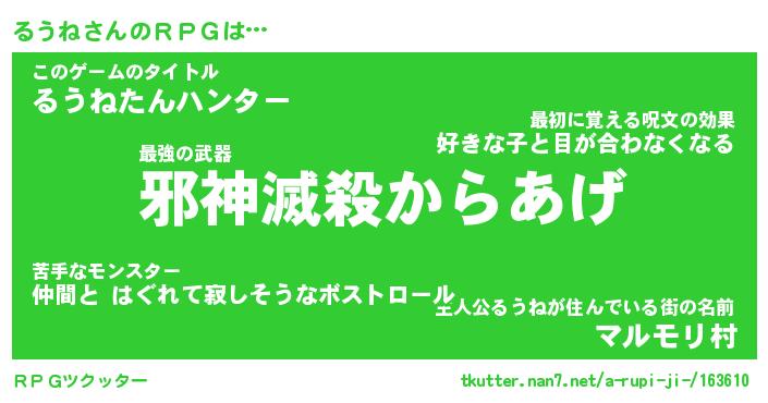 | ヘコむあだ名 | 『るうもー』『つくし』『るう太郎』 |
