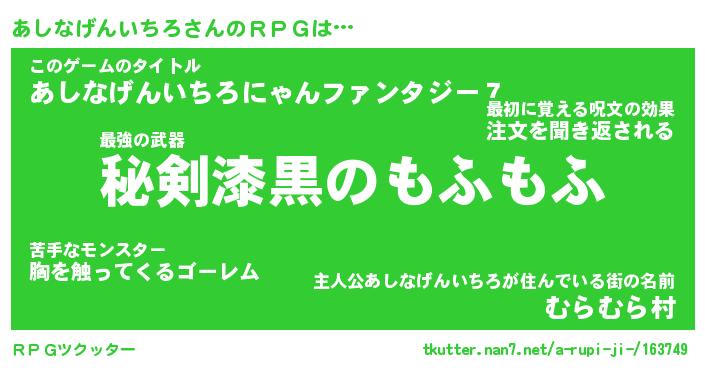 | 男性向けラノベタイトル風あだ名 | 『あしなげんいちろの憂鬱』 |