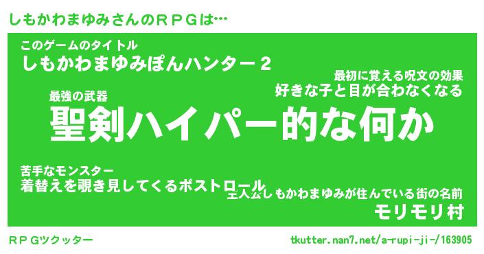 | 伝説のあだ名 | 『伝説の竜騎士しもかわまゆみ』 |