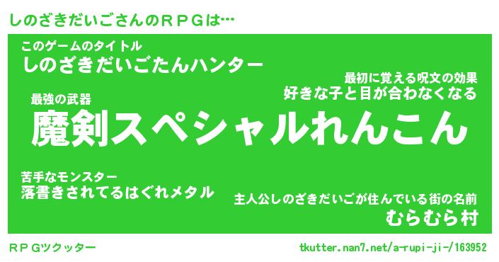 | 男性向けラノベタイトル風あだ名 | 『しのざきだいごの憂鬱』 |