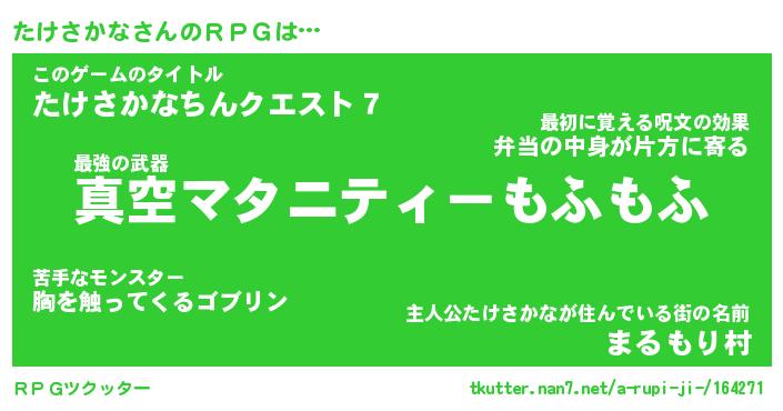 | ファンタジー風あだ名 | 『タケフェル』『エターナルタケサカナー』 |