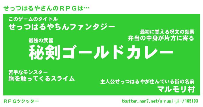 | 伝説のあだ名 | 『伝説のスナイパーせっつはるや』 |