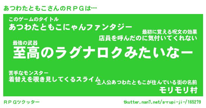 | 男性向けラノベタイトル風あだ名 | 『アツワタトモコアートオンライン』 |