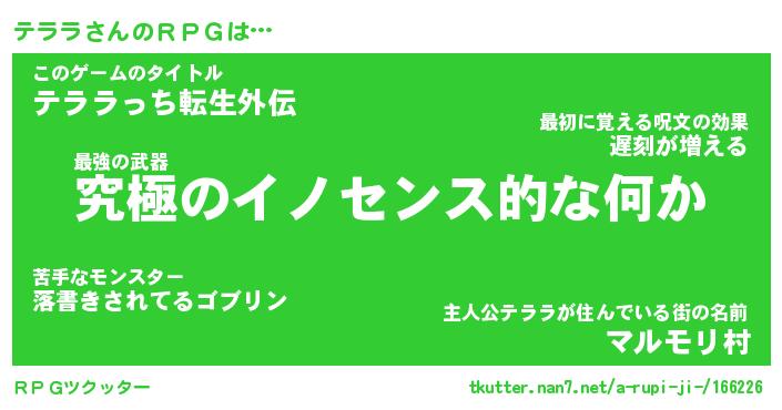 | 男性向けラノベタイトル風あだ名 | 『テララアートオンライン』 |