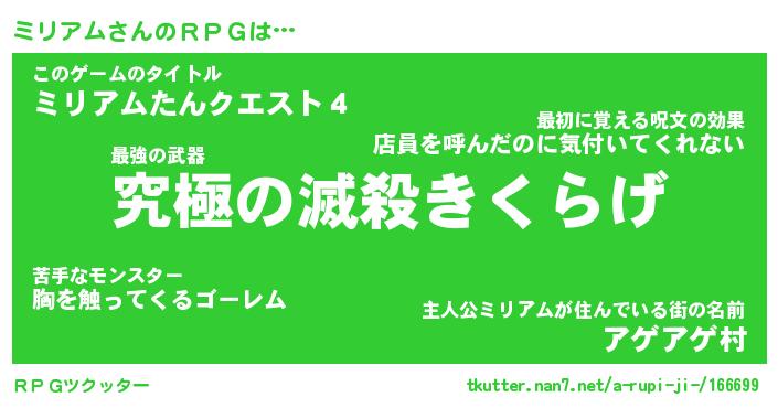 | 胡散臭い通販商品みたいなあだ名 | 『モテモテ間違いなし霊験あらたかなお札…その名も「ミリアム」』 |