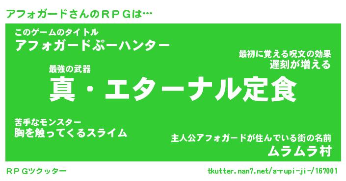 | ヒーロー風カッコイイあだ名 | 『スーパーアフォガード』『幻影騎士アフ』 |