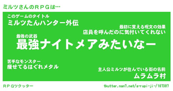 | ヘコむあだ名 | 『ミルっふぃ~』『つくし』 |