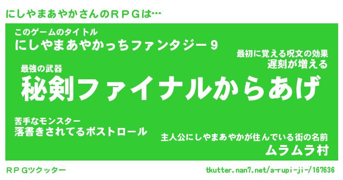 | 胡散臭い通販商品みたいなあだ名 | 『必ず成功する水晶球…その名も「にしやまあやか」』 |