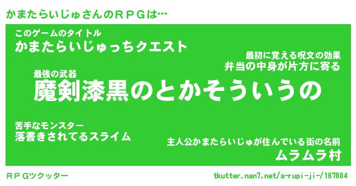 | 男性向けラノベタイトル風あだ名 | 『かまたらいじゅの憂鬱』 |