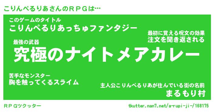| 男性向けラノベタイトル風あだ名 | 『こりんぺるりあの憂鬱』 |