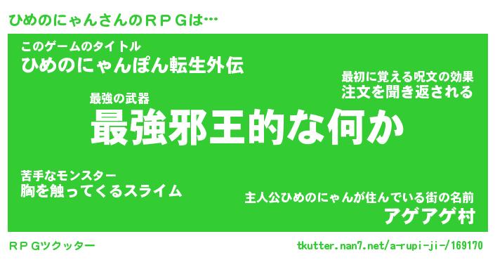 | 男性向けラノベタイトル風あだ名 | 『ヒメノニャンアートオンライン』 |