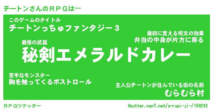 | 男性向けラノベタイトル風あだ名 | 『チートンの憂鬱』 |
