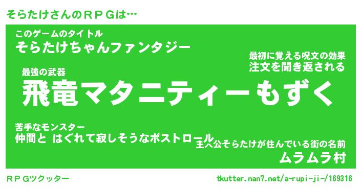 | ファンタジー風あだ名 | 『ソラフェル』『エターナルソラタケー』 |