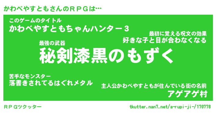 | 男性向けラノベタイトル風あだ名 | 『かわべやすともの憂鬱』 |