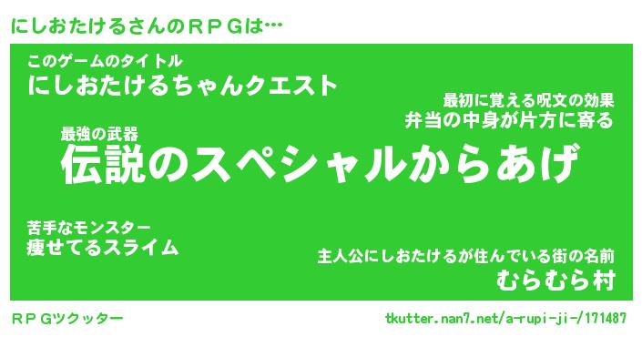 | 男性向けラノベタイトル風あだ名 | 『にしおたけるの憂鬱』 |