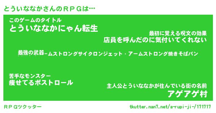 | 男性向けラノベタイトル風あだ名 | 『トウイナナカアートオンライン』 |