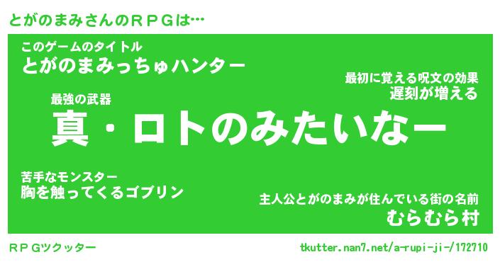 | 男性向けラノベタイトル風あだ名 | 『トガノマミアートオンライン』 |