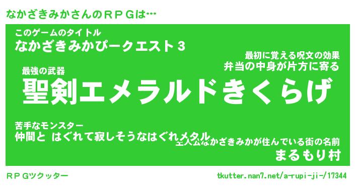 | 伝説のあだ名 | 『伝説のスナイパーなかざきみか』 |