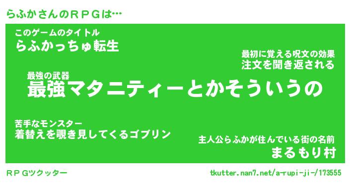| 男性向けラノベタイトル風あだ名 | 『ラフカアートオンライン』 |