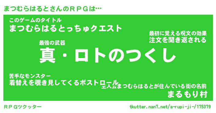 | 男性向けラノベタイトル風あだ名 | 『マツムラハルトアートオンライン』 |